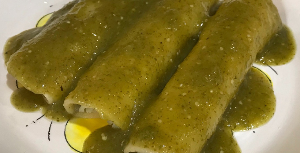 5. Next, plate your enchiladas and drizzle the green salsa over them. You can drizzle as much or as little as you want.